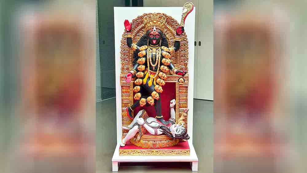 লন্ডনের ব্রিটিশ মিউজ়িয়মে অধিষ্ঠান কুমোরটুলির কালীর! ফি-বছর এ শহর থেকে বিলেতে ও বিদেশে দুর্গাঠাকুর যায় সে জানা কথা, কিন্তু এই উদ্যোগ খানিক আলাদা— নারীশক্তির ক্ষমতায়ন বিষয়ক এক প্রদর্শনী। তারই প্রতীক হিসাবে তিন দেবী— গ্রিসের আথেনা, মিশরের সেখমেতের সঙ্গে কলকাতার কালীর উদ্বোধন হল গত ১৭ মে। আজানুলম্বিত মুণ্ডমালা, পদতলে শিব, পিছনে সোনালি চালচিত্র (ছবিতে)। এই কালীপ্রতিমা তৈরি করেছেন কুমোরটুলির কৌশিক ঘোষ। গত প্রায় ছয় দশক ধরে ক্যামডেন শহরে দুর্গাপুজো হয়ে আসছে, ‘ইউরোপের প্রথম’, দাবি উদ্যোক্তাদের। ব্রিটিশ মিউজ়িয়মের এই প্রদর্শনী-ভাবনাসূত্রেই তাদের সঙ্গে যুক্ত হয়েছেন ক্যামডেন দুর্গাপুজো কমিটির প্রধান আনন্দ গুপ্ত, প্রদর্শনী আরও প্রাণময় হয়েছে তাঁর নির্দেশনায় রবীন্দ্র-নৃত্যনাট্য চিত্রাঙ্গদা-র পরিবেশনায়।