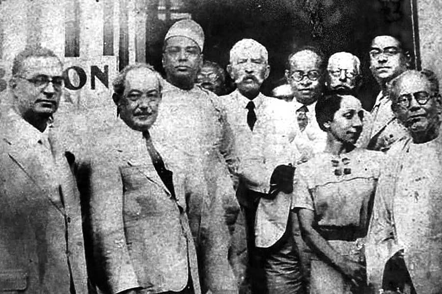 ১৯০৭-এ কলকাতায় ইন্ডিয়ান সোসাইটি অব ওরিয়েন্টাল আর্ট প্রতিষ্ঠার পর খুলে যাচ্ছিল শিল্পের নবদিগন্ত। সোসাইটির প্রদর্শনীতে স্থান পায় জাপানি উডকাট, অন্য দিকে ১৯১৪-র প্যারিস সাক্ষী থাকে সোসাইটির শিল্পকৃতির। ১৯১৯-এ কলাভবনের শুরু, ও দিকে জার্মানির ওয়েইমারে ওয়াল্টার গ্রোপিয়াস-এর উদ্যোগে গড়ে ওঠে ‘বাওহাউস’— ‘ফাইন আর্ট’ ও ‘অ্যাপ্লায়েড আর্ট’-এর সেতুবন্ধ। সে বছরেই লন্ডনে রবীন্দ্র-সাক্ষাৎ স্টেলা ক্রামরিশ-এর, পরে তিনি আসেন ভারতে। রবীন্দ্রনাথ গগনেন্দ্রনাথ অবনীন্দ্রনাথের উৎসাহে, স্টেলার উদ্যোগে ১৯২২-এর ডিসেম্বরে সোসাইটি অব ওরিয়েন্টাল আর্ট-এর চতুর্দশ বার্ষিক প্রদর্শনীতে দেখানো হয় বাওহাউস শিল্পীদের অনেকগুলি কাজ, পাশাপাশি কান্দিনস্কি ও পল ক্লি-র ছবি; অবনীন্দ্র গগনেন্দ্র সুনয়নী দেবী নন্দলাল বসু অসিত হালদার হ্যাভেল রদেনস্টাইন কুমারস্বামী ও স্টেলার কাজও। ঐতিহাসিক সেই প্রদর্শনী শতবর্ষ পেরোল। ‘সহযান’ ও ‘কালচারাল অ্যাক্টিভিস্টস অব বেঙ্গল’-এর উদ্যোগে তারই স্মারক প্রদর্শনী চলছে গত ২৩ ডিসেম্বর থেকে, ৫০/১ হিন্দুস্তান পার্কের ‘চারু কারু’-তে, আজ শেষ দিন। ছবিতে সম্ভবত ১৯২২-এর সেই প্রদর্শনী-ভবনদ্বারে বিশিষ্টজন, একেবারে ডান দিকে স্টেলা ক্রামরিশ ও অবনীন্দ্রনাথ ঠাকুর।