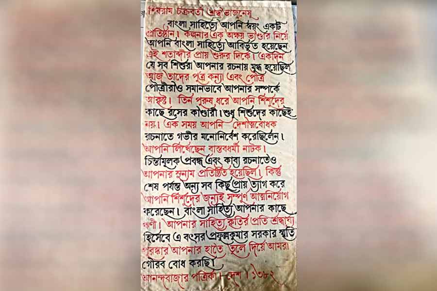 এক বইদোকান ছিল, নাম ‘শিব্রাম চকরবরতীর বইয়ের দোকান’। ১৯৭৪-এ কলেজ স্ট্রিট মার্কেটের সে দোকান থেকেই বেরোয় শিব্রাম রচনাবলী, খোদ লেখক সম্পাদিত। দোকানটি শিবরাম করে দিয়েছিলেন পাড়ার পাতানো ভাগনে গোপাল বন্দ্যোপাধ্যায়কে। দুজনকে নিয়ে চালু নানা গল্প— এক বার শিবরামের অনুপস্থিতিতে তাঁর মুক্তারামবাবু স্ট্রিটের মেসবাড়ির ঘরের দেওয়াল চুনকাম করে দেন গোপালবাবু, যে দেওয়ালে পরিচিতজনের ঠিকানা-ফোন নম্বর লিখে রাখতেন লেখক! ঘরে ফিরে ফর্সা দেওয়াল দেখে রেগে গোপালবাবুর সঙ্গে দীর্ঘ দিন কথা বলেননি শিবরাম। গোপালবাবুর ছেলে জয়দীপ বন্দ্যোপাধ্যায়ের কাছে শিবরামের ১৯৭৫-এ পাওয়া ‘প্রফুল্লকুমার সরকার স্মৃতি পুরস্কার’-এর মানপত্র (ছবিতে) রাখা আজও। সন্ধান মিলেছে লেখকের ইচ্ছাপত্রেরও, শিবরামের বইয়ের স্বত্ব প্রদত্ত গোপাল বন্দ্যোপাধ্যায় ও শিবরাম-ভ্রাতা শিবসত্য চক্রবর্তীকে। এমন জানা-অজানা তথ্য, সঙ্গে শৈল চক্রবর্তীর অলঙ্করণে ৩১টি হাসির গল্প নিয়ে ‘বুক ফার্ম’ প্রকাশ করল লেখায় শিব্রাম, রেখায় শ্রীশৈল দ্বিতীয় খণ্ড (সম্পা: সুশান্ত রায়চৌধুরী ও বিশ্বদেব গঙ্গোপাধ্যায়)। ১৩ ডিসেম্বর জন্মদিন ছিল শিবরামের, প্রকাশনাঘরে হল সম্পাদক ও শিবরাম-ভক্তদের আড্ডা।