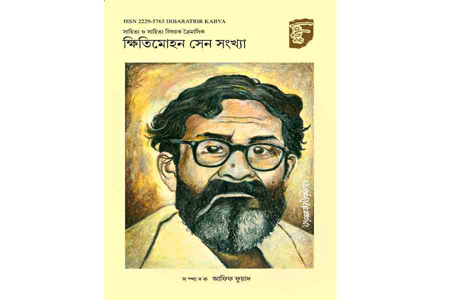 ১৯০৪ সালে রবীন্দ্রনাথকে প্রথম দেখেন ক্ষিতিমোহন সেন— কার্জন থিয়েটারে ‘স্বদেশি সমাজ’ প্রবন্ধপাঠের এসেছিলেন কবি। চার বছর পর রবীন্দ্রনাথের আমন্ত্রণে তাঁর শান্তিনিকেতন আসা, তিন দশকেরও বেশি রবীন্দ্রসান্নিধ্য, ১৯৪১-এ আশ্রম থেকে কবির শেষ বিদায়ক্ষণ পর্যন্ত। কবীর দাদূ রজ্জব প্রমুখ মরমিয়া সাধকদের চিনিয়েছিলেন ক্ষিতিমোহন, তাঁর মননাশ্রয়ে ভারতীয় মধ্যযুগের সাধনার ধারা, ভারতে হিন্দু-মুসলমানের যুক্ত সাধনা মূর্ত হয়েছে গ্রন্থাকারে, লিখেছেন বাউল থেকে রামমোহন, নানা বিষয়ে। বিভেদে দীর্ণ এই সময়ে তাঁকে পড়া দরকার আরও বেশি করে। সেই তাগিদ থেকেই ‘ক্ষিতিমোহন সেন বিশেষ সংখ্যা’ প্রকাশ করেছে দিবারাত্রির কাব্য পত্রিকা (সম্পা: আফিফ ফুয়াদ)। ৩৮টি প্রবন্ধ, বাংলার সাধনা-র পুনর্মুদ্রণ, সারস্বতের জীবন ও কাজকে ফিরে দেখা। সঙ্গের ছবিতে পত্রিকার প্রচ্ছদ।