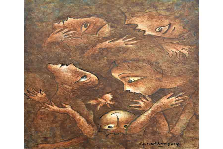 স্কেচখাতায় দুশোরও বেশি পাতায় কখনও ওয়াশে, তুলি-কালিতে, কিংবা কালি-কলমে করা স্কেচ। আবার ছবির পাশাপাশি নিজস্ব শিল্পভাবনাও লেখা। রয়েছে চিঠির মকশোও, কে জি সুব্রহ্মণ্যন তথা ‘মানিদা’-কে শান্তিনিকেতনের কলাভবনে অধ্যাপক হিসেবে যোগদানের আহ্বান। সনৎ করের ১৯৭৯ সালের এই স্কেচখাতায় আশির দশকে শিল্পীর করা কিছু লিথোগ্রাফের প্রাথমিক লেআউটও আভাসিত। ফার্ন রোডের দেবভাষা বই ও শিল্পের আবাসে গত ২ সেপ্টেম্বর থেকে শুরু হয়েছে বর্ষীয়ান চিত্রশিল্পী সনৎ করের একক চিত্রপ্রদর্শনী ‘জার্নি অব ফিফটি ইয়ারস’, তারই প্রারম্ভে প্রকাশিত হল এই স্কেচখাতাও। প্রদর্শনীতে প্রায় ৫০টি চিত্রকৃতি— উড ইনট্যাগলিয়ো সানমাইকা ইনট্যাগলিয়ো এচিং লিথোগ্রাফ টেম্পারা প্যাস্টেল ড্রয়িং-এর সম্ভার (ছবিতে একটি), পাঁচ দশকের। ২৩ সেপ্টেম্বর পর্যন্ত, মঙ্গলবার বাদে দুপুর আড়াইটে থেকে রাত সাড়ে ৮টা।