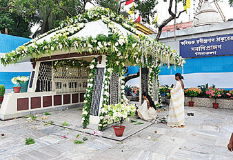 সম্মুখে শান্তি পারাবার/ভাসাও তরণী হে কর্ণধার। পঞ্চাশের দশকে রবীন্দ্রভারতী সোসাইটির সম্পাদক বিমলচন্দ্র সিংহ নিমতলা শ্মশানে কবির শেষকৃত্যের স্থানে সৌধ স্থাপনে ব্রতী হন। রবীন্দ্রনাথের ভাবনার সঙ্গে সঙ্গতি রেখে শিল্পী সুনীল পালের পরিকল্পনায় ও নন্দলাল বসুর অনুমোদনে নির্মিত স্মারকটি বাংলার চালাঘরের আকৃতির। সার্ধ শতবর্ষ উপলক্ষে রাজ্য সরকার ও পুরসভার উদ্যোগে ঐতিহাসিক স্থানটি অভিনব পরিকল্পনায় ‘রবীন্দ্রনাথ ঠাকুর স্মৃতি প্রাঙ্গণ’ হিসেবে নতুন রূপ পেয়েছে। সৌধ সংলগ্ন বেশ কয়েকটি কাঠের চুল্লি বুজিয়ে, রাস্তা থেকে গঙ্গার ঘাট পর্যন্ত একটি বিশাল প্রাঙ্গণ গড়ে তোলা হয়েছে। গোলাকার বাগানের মাঝে কবির সৌধটি নতুন সৌষ্ঠব পেয়েছে। বছর দেড়েক আগে সাধারণের জন্য উন্মোচিত ‘রবীন্দ্রনাথ টেগোর মেমোরিয়াল গার্ডেন’ বিচিত্র আলোকসজ্জায় সজ্জিত। গত কাল এখানেই কবির ৭৫তম প্রয়াণ দিবসে কলকাতা পুরসভা, রবীন্দ্রভারতী সোসাইটি ও নানা প্রতিষ্ঠানের মিলিত উদ্যোগে কবির প্রতি শ্রদ্ধা নিবেদিত হল।