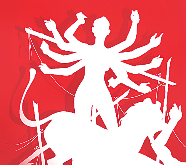 দুর্গা এখন বিদেশেও জনপ্রিয়। আর ক’দিন পরেই এই শহরেই শুধু নয়, বরং সেই আলোর বেণু সাড়া জাগাবে সারা বিশ্বে। ক’দিন আগেই এই শহরের শিল্পী পার্থ দাশগুপ্ত পাড়ি জমিয়েছিলেন সুদূর নিউ জার্সিতে, সঙ্গে ছিলেন আর এক শিল্পী শিবশঙ্কর দাস। সেখানে ভারতীয় বংশোদ্ভূত স্থপতি যোগেশ মিস্ত্রির নকশায় তৈরি হল একটি বড় দুর্গামণ্ডপ ‘আনন্দমন্দির’। ২০ একর জায়গা জুড়ে এই মন্দির প্রাঙ্গণেই গড়ে উঠেছে রবি ঠাকুরের নামাঙ্কিত একটি কমিউনিটি হল। দেড় বছরের পরিশ্রমে সম্প্রতি শেষ হল কাজটি। উল্লেখ্য এখানকার দুর্গা প্রতিমাটিও কিন্তু পাড়ি জমিয়েছিল এই কলকাতা থেকেই! পার্থবাবুর সঙ্গে তথাকথিত থিমপূজার যোগ দীর্ঘদিনের। শান্তিনিকেতনের সেই ইতিহাস হয়ে যাওয়া বাঁধন দাসের পুজোর দায়িত্বও এক সময় ছিল ওঁর কাঁধে। সেই সময় থেকেই ফি বছর তিনি নতুন কিছু ভাবনা উপহার দেন এই শহরের শিল্পরসিকদের। সেই কাজের সূত্র ধরেই তিনি ও দেশে দেখিয়ে এলেন দুর্গা নিয়ে একটি তথ্যচিত্র ‘আনন্দকীর্তি’। এ বারে পার্থবাবু কাজ করছেন বেহালা নূতন দল–এ। দুর্গা মাতৃরূপে ধারণ করে আছেন সমগ্র সৃষ্টি, সে কারণেই তিনি ধরিত্রীর সঙ্গে একাত্ম। নানা নামে তিনি মেদিনী, বসুন্ধরা, পৃথিবী বা জগন্মাতা। আসলে মায়ের রূপেই তিনি বিরাজমান।