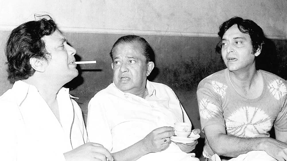 ঢাকার নবাব এস্টেটের সদর মোক্তার জিতেন্দ্রনাথ বন্দ্যোপাধ্যায়ের ছেলে ম্যাটিনি শো দেখতে যেতেন দীনেশ গুপ্তের সাইকেলের কেরিয়ারে বসে। রাইটার্স বিল্ডিংসে হামলার জেরে দীনেশের যে দিন ফাঁসি হয়, সাম্যময় অর্থাৎ ভানু বন্দ্যোপাধ্যায় তখন এগারো। মুক্তির চেতনা পরে তাঁকে চালিত করেছিল ‘অনুশীলন সমিতি’ হয়ে আরএসপি-র ছাত্র সংগঠনে, আরও পরে কংগ্রেস সরকারের নাট্য নিয়ন্ত্রণ বিলের বিরুদ্ধে আন্দোলনে বা শিল্পী-কলাকুশলীদের স্বার্থে অভিনেতৃ সঙ্ঘে গুরুত্বপূর্ণ ভূমিকায়। কিন্তু ২৬ অগস্ট যাঁর শতবর্ষ শুরু হল, তাঁকে কি বাঙালি চিনেছে? পঞ্চাশের দশকের গোড়ায় বসু পরিবার এবং পরে সাড়ে চুয়াত্তর ছবি দিয়ে জয়যাত্রা শুরু, এক দশকের মধ্যে খ্যাতির বিচারে তিনিই কার্যত বাংলা কমেডির উত্তমকুমার। তাঁর নাম দিয়ে ছবি হচ্ছে, চ্যাপলিনের এই ভাগ্য হয়নি, উত্তমেরও নয়। হয়তো সেটাই কাল হল, ইন্ডাস্ট্রি তাঁকে হাসির বাইরে বেরোতে দিল না। নির্ধারিত শিল্পীর অনুপস্থিতিতে বা অমৃতকুম্ভের সন্ধানে ছবিতে তাঁর সিরিয়াস অভিনয় কি বাঙালি মনে রেখেছে? কেরিয়ারের শুরুতে বিমল রায়ের তথাপি ছবিতে ভানুর সহ-অভিনেতা ছিলেন ঋত্বিক ঘটক। কিন্তু ঋত্বিক বা সত্যজিতের ছবিতে সে দিনের তুলসী, জহর, সত্য বন্দ্যোপাধ্যায়, হরিধন মুখোপাধ্যায়রা থাকলেও তিনি নেই। সব চরিত্র ছাপিয়ে ‘ভানু’ হয়ে উঠছিলেন বলে? শতবর্ষে তাঁকে নিয়ে চর্চা হচ্ছে। সুচন্দ্রা ভানিয়ার প্রযোজনায় ‘জাস্ট স্টুডিয়ো’-র তৈরি তথ্যচিত্র ভানু একাই একশো তাঁর শততম জন্মদিনে ইউটিউবে এল, সেখানে সাবিত্রী চট্টোপাধ্যায়, লিলি চক্রবর্তী, মেঘনাদ ভট্টাচার্য, বিপ্লব চট্টোপাধ্যায়, পরাণ বন্দ্যোপাধ্যায় থেকে প্রসেনজিৎ চট্টোপাধ্যায়, শাশ্বত চট্টোপাধ্যায়, খরাজ মুখোপাধ্যায়, শুভাশিস মুখোপাধ্যায়, গৌতম হালদার, কাঞ্চন মল্লিক-সহ সকলের মুগ্ধতা, পুত্র গৌতম বন্দ্যোপাধ্যায় বা কন্যা বাসবী ঘটকের স্মৃতিলেখ। ইস্টবেঙ্গল ভক্তদের ফেসবুক পেজেও ভানুকে নিয়ে স্মৃতিময় শ্রদ্ধার্ঘ্য। সব কিছু ছাপিয়ে তবু জেগে থাকে প্রশ্ন, তাঁর মতো সমাজ ও রাজনীতি-সচেতন অথচ ‘ছাঁচবন্দি’ শিল্পীর যথার্থ মূল্যায়ন কবে হবে? ছবিতে উত্তমকুমার ও সৌমিত্র চট্টোপাধ্যায়ের সঙ্গে ভানু বন্দ্যোপাধ্যায়।