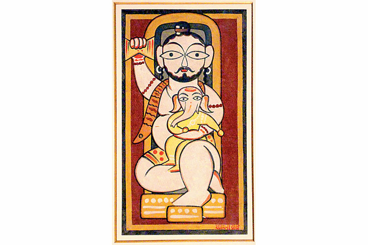 ব্রহ্মা, বিষ্ণু, মহেশ্বর— এই ত্রয়ীর মধ্যে শিব আমজনতার কাছের জন। ভারতের লৌকিক পরিমণ্ডলে শিবের গুরুত্ব কম নয়। কৈলাসবাসী এই যোগী মাত্র একটি বেলপাতাতেই তুষ্ট হন। নটরাজ শিবকে ‘কসমিক ডান্সার’ হিসেবেও উল্লেখ করা হয়। নৃত্য-নাট্য প্রভৃতি রসকলার স্রষ্টাও তিনি। স্ত্রী পার্বতী এবং পুত্র কার্তিক-গণেশকে নিয়ে ওঁর সংসার। কন্যা হিসেবে লক্ষ্মী-সরস্বতী যুক্ত হয়েছেন অনেক পরে। ভারতীয় চিত্রকলায় নানা রূপে এসেছেন তিনি। এই বাংলাতেও শিববন্দনার সূত্র মেলে শিল্পের নানান ধারায়। বাংলার প্রাচীন চিত্রকলা থেকে কালীঘাট পট, লৌকিক শিল্প বা যামিনী রায় (সঙ্গের ছবি)— নানা নিদর্শন মিলিয়ে ১২ অগস্ট থেকে চিত্রকূট আর্ট গ্যালারিতে শুরু হচ্ছে ‘ওম নমঃ শিবায়, শিব ইন বেঙ্গল আর্ট’ প্রদর্শনী, চলবে ৩১ অগস্ট পর্যন্ত, ৩-৮টা।