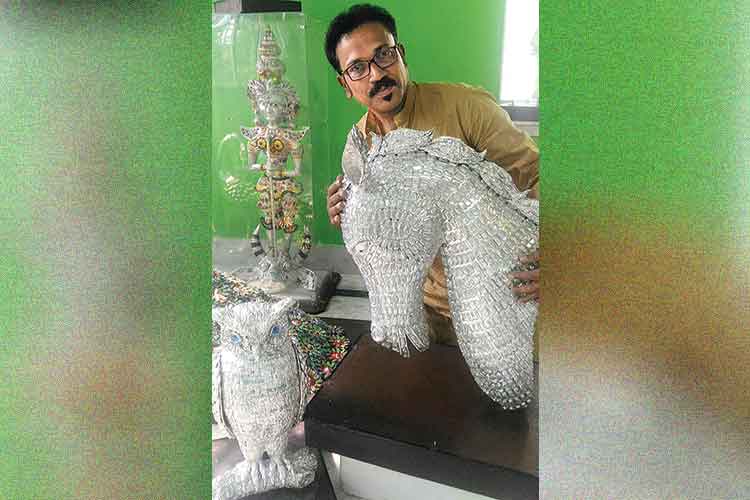প্লাস্টিক ব্যবহারে দূষণ নিয়ে বিশ্ব জুড়ে মানুষের কপালে চিন্তার ভাঁজ! তাই অন্যের দিকে আঙুল না তুলে, যত্রতত্র ওষুধের ফয়েল স্ট্রিপ না ফেলে, প্লাস্টিক বর্জ্য থেকে ভাস্কর্য ভাবনা, বলছিলেন স্বশিক্ষিত শিল্পী বিমান নাগ। ছোটবেলায় হরিণঘাটার দুধের বোতলের ছিপি, কাঠের ছিলকা, কাপড়, কাগজ প্রভৃতি দিয়ে কোলাজ গ্রিটিংস কার্ড তৈরি করতেন। বানাতেন সরস্বতী প্রতিমা। মাধ্যমিকে ওয়ার্ক এডুকেশন পরীক্ষায় হরিণঘাটার দুধের ছিপি দিয়ে সরস্বতী ঠাকুর বানিয়ে স্কুলে সবচেয়ে কম নম্বর প্রাপ্তি, কারণ পরীক্ষক বিশ্বাসই করতে চাননি এই সৃজন তাঁর। সেই বছরে গড়িয়ার মিতালী সঙ্ঘের দুর্গাপুজোয় নবদুর্গার সঙ্গে তাঁর তৈরি হরিণঘাটার দুধের ছিপির দুর্গাও প্রদর্শিত হয়, প্রশংসার পাশাপাশি শিল্পভবন থেকে প্রদর্শনীর ডাক আসে। পরবর্তীতে দুধের ছিপির অভাবে ওষুধের ফয়েল ও স্ট্রিপ দিয়ে ভাস্কর্য সৃজন প্রচেষ্টা (সঙ্গের ছবি)। বর্তমানে পেশায় লোকো পাইলট অর্থাৎ ট্রেন চালক। ইতিমধ্যে দেশ বিদেশে শিল্পীর ৩০টি দলগত প্রদর্শনী হয়েছে। অ্যাকাডেমিতে সম্প্রতি হয়ে গেল তাঁর একক প্রদর্শনী।