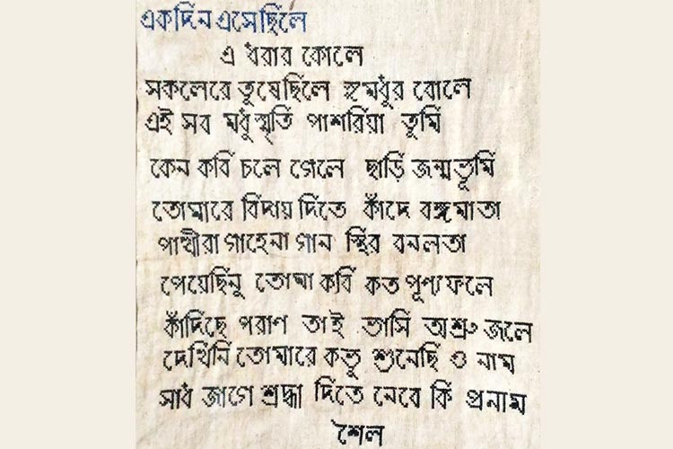 এলগিন রোডে পর্বতারোহী জগন্নাথ দত্তের একান্নবর্তী পরিবারে থাকতেন তাঁর দূর সম্পর্কের বাল্যবিধবা পিসিমা শৈলবালা। পুঁথিগত শিক্ষা তেমন না থাকলেও সেলাই ফোঁড়াইয়ে সিদ্ধহস্ত ছিলেন। ১৯৪১-এ রবীন্দ্রনাথের প্রয়াণে তিনি স্বরচিত কবিতায় চিত্র গাঁথলেন কাপড়ে শাড়ির পাড়ের সুতোয়: ‘‘একদিন এসেছিলে/ এ ধরার কোলে/ সকলেরে তুষেছিলে সুমধুর বোলে/ এই সব মধু স্মৃতি পাশরিয়া তুমি/ কেন কবি চলে গেলে ছাড়ি জন্মভূমি/ তোমারে বিদায় দিতে কাঁদে বঙ্গমাতা/ পাখীরা গাহেনা গান স্থির বনলতা/ পেয়েছিনু তোমা কবি কত পূণ্যফলে/ কাঁদিছে পরাণ তাই ভাসি অশ্রু জলে/ দেখিনি তোমারে কভু শুনেছি ও নাম/ সাধ জাগে শ্রদ্ধা দিতে নেবে কি প্রনাম/ শৈল’’ (বানান অপরিবর্তিত)। পরিবারে সযত্নে সংরক্ষিত, ত্রিশ বছর আগে প্রয়াত শৈলবালার সেই অসামান্য শিল্পকর্ম এ বার গোচরে এল বিশিষ্ট সংগ্রাহক পরিমল রায়ের সৌজন্যে।
