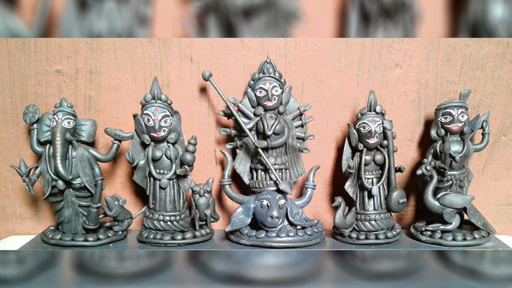 সাধারণের মধ্যে তিনি দেখতে পান অসাধারণকে। রোজকার তুচ্ছ নগণ্য যে জিনিসগুলো শিল্প-পরিসরের ত্রিসীমায় আনতে বাধো বাধো ঠেকে আমাদের, সে সব দিয়েই প্রতি বছর একটি দুর্গাঠাকুর গড়েন বনহুগলির রাইমোহন ব্যানার্জি রোডের বাসিন্দা হরিসাধন বিশ্বাস। বিরাট প্রতিমা নয়, মিনিয়েচার শিল্প। রবারের পাইপ, গেঞ্জির কাপড়, খবরকাগজের টুকরো, তেজপাতা, ফুলের পাপড়ি, বীজ, ইলেকট্রিক তার, ময়দা, ট্যাবলেট, চামড়ার টুকরো থেকে পেঁয়াজের খোসা— এ সবই তাঁর ঠাকুর গড়ার উপকরণ। ২০০৪ থেকে শুরু, এ পর্যন্ত বানিয়েছেন সতেরোটি দুর্গা। বাড়িতে পাইপ বা অন্যত্র ‘লিকেজ’ আটকাতে ব্যবহৃত হয় রজনের তৈরি যে বস্তুটি, তা দিয়েই এ বছর আড়াই ইঞ্চির দুর্গাঠাকুর বানিয়েছেন শিল্পী (ছবিতে)। আছেন লক্ষ্মী-সরস্বতী-কার্তিক-গণেশ, মহিষ ও অন্য বাহনগুলিও অপরূপ। ফি-বছর পুজোর আগে কাজে বসা, রোজ কয়েক ঘণ্টার নিষ্ঠায় পনেরো-কুড়ি দিনে তৈরি হল এ বারের ঠাকুর।