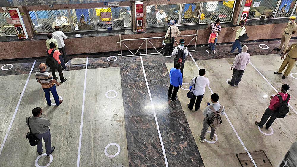 হাওড়া ও শিয়ালদা থেকে লোকাল ট্রেন চালু হয়েছে দিন কুড়ি হল। ‘ভিড় হচ্ছে’, ‘ভিড় একই রকম হচ্ছে’, ‘না তো ভিড় কোথায়’— নানা মত ও তর্ক ভাসছে। শহরতলি বা আরও দূরের লোকাল ট্রেন শিয়ালদায় এসে থামতে সেই হুড়োহুড়ি করে নামার চেনা দৃশ্য, তফাত বলতে যাত্রীদের মুখ ঢাকা মাস্কে। শিয়ালদায় টিকিট কাউন্টারের সামনে সাদা গোল্লা, হাতে সময় থাকলে নিয়ম মেনেই যাত্রীরা দাঁড়িয়ে আছেন সেখানে (ছবিতে), চোখে পড়ছে তাও।