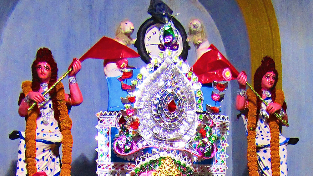 দুই পাশে পতাকা হাতে দু’টি নারীমূর্তি, পরিবারে যাদের পরিচিতি ‘পরি’। তার উপরে একটি ঘড়ি, যা ধরে রেখেছে দু’টি সিংহ— যেমন দেখা যায় অনেক ঔপনিবেশিক স্থাপত্যে। ঘড়িতে সময় ন’টা। ঘড়ির উপরে একটু ঝুঁকে বসে আছে একটি কাক! উনিশ শতকের বিশিষ্ট আইনজীবী, বিদ্যাসাগর-সুহৃদ বাবু শ্রীনাথ দাসের বৌবাজারের বাড়ির জগদ্ধাত্রী প্রতিমার চালি ঔপনিবেশিক ইতিহাস ও লোকসংস্কৃতির মিশেলে অভিনব ও ব্যতিক্রমী। লোকবিশ্বাস, দিনের প্রথম প্রহরে, বাড়িতে অগ্নিকোণের দিকে মুখ করে কাক ডাকলে সে বাড়িতে সন্তান জন্মায়। দাস বাড়িতে জগদ্ধাত্রী পুজোর এ বছর ১৮৯তম বর্ষ। যাবতীয় কোভিড-বিধি মেনেই পুজো আজ। প্রতিমা বিসর্জনের সময় চালার দু’টি পরি খুলে নেওয়া হয়।