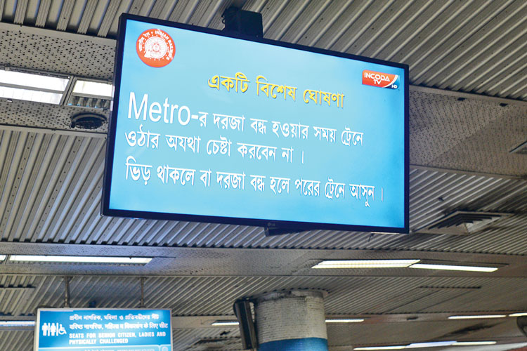 উদ্যোগ: যাত্রীদের সতর্ক করতে সব মেট্রো স্টেশনের প্ল্যাটফর্মে দেখানো হচ্ছে এই বার্তা। নিজস্ব চিত্র