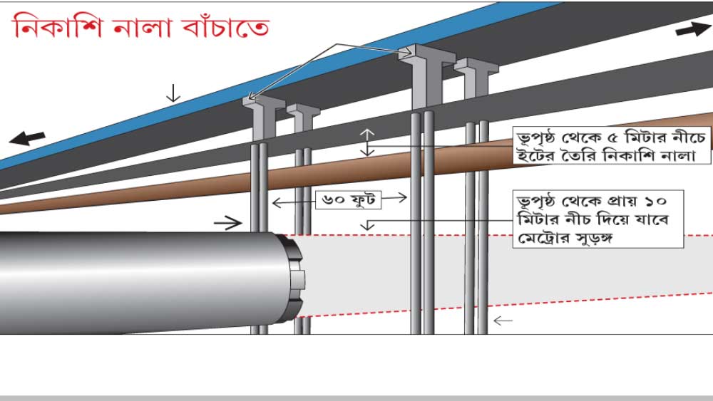 মাটির প্রায় ৪-৫ মিটার নীচে থাকা ওই নিকাশির সঙ্গে এসে মিশেছে বৌবাজারের দিক থেকে আসা আর একটি নিকাশি নালা। তার পরে দু’টি নিকাশি একযোগে গিয়েছে পামারবাজার পাম্পিং স্টেশনের দিকে। বৌবাজারের দিক থেকে ইস্ট-ওয়েস্ট মেট্রোর সুড়ঙ্গ আসার সময়ে সেটি ক্রমশ মাটির উপরে উঠে এসেছে। শিয়ালদহ এবং ফুলবাগান স্টেশন পেরিয়ে শেষ হচ্ছে ওই সুড়ঙ্গ। তার পরের অংশ, অর্থাৎ সল্টলেক স্টেডিয়ামের দিকে মেট্রোপথ গিয়েছে মাটির উপর দিয়ে। সেই পথের সঙ্গে সাযুজ্য রাখতেই শিয়ালদহে সুড়ঙ্গ ক্রমশ উঠে এসেছে মাটির উপরে। বিদ্যাপতি সেতুর নীচে আন্ডারপাসের গা-ঘেঁষে শ্যামবাজারের দিকে একটি ৬০ ফুট স্প্যানের (সেতুর দু’টি অবলম্বনের মাঝের দূরত্ব) মাঝখান দিয়ে যাওয়ার কথা পূর্বমুখী সুড়ঙ্গের। ওই জায়গা দিয়ে যাওয়ার সময়ে ভূগর্ভস্থ নিকাশি থেকে সুড়ঙ্গের নিরাপদ দূরত্ব থাকাও জরুরি।