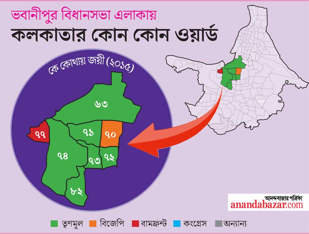 কলকাতা পুরসভার ৬৩, ৭০, ৭১, ৭২, ৭৩, ৭৪, ৭৭ এবং ৮২ নম্বর ওয়ার্ড নিয়ে ভবানীপুর বিধানসভা কেন্দ্র। ২০১৫ সালের পুরভোটে মমতার কেন্দ্রে ৭০ এবং ৭৭ নম্বর ওয়ার্ডে হেরে গিয়েছিল শাসক তৃণমূল। ৭০ নম্বর ওয়ার্ডে জিতেছিলেন বিজেপি-র প্রার্থী অসীম বসু। আর ৭৭ নম্বর ওয়ার্ডে জয়ী হয়েছিলেন বামফ্রন্ট প্রার্থী শমিমা রেহান খান। ঘটনাচক্রে, দুজনেই এখন তৃণমূলে। এবং এ বারের পুরভোটে ৭০ এবং ৭৭ নম্বর ওয়ার্ডে তাঁদেরই প্রার্থী করেছে জোড়াফুল শিবির। বাকি ওয়ার্ডগুলিতে জয় নিয়ে কোনও সংশয় নেই তৃণমূল নেতৃত্বের। তবে একইসঙ্গে বলে রাখা যাক, ২০১৪ এবং ২০১৯ সালের লোকসভা ভোটে ৬৩, ৭০, ৭১, ৭২, ৭৩ এবং ৭৪ নম্বর ওয়ার্ডে এগিয়ে গিয়েছিল বিজেপি।