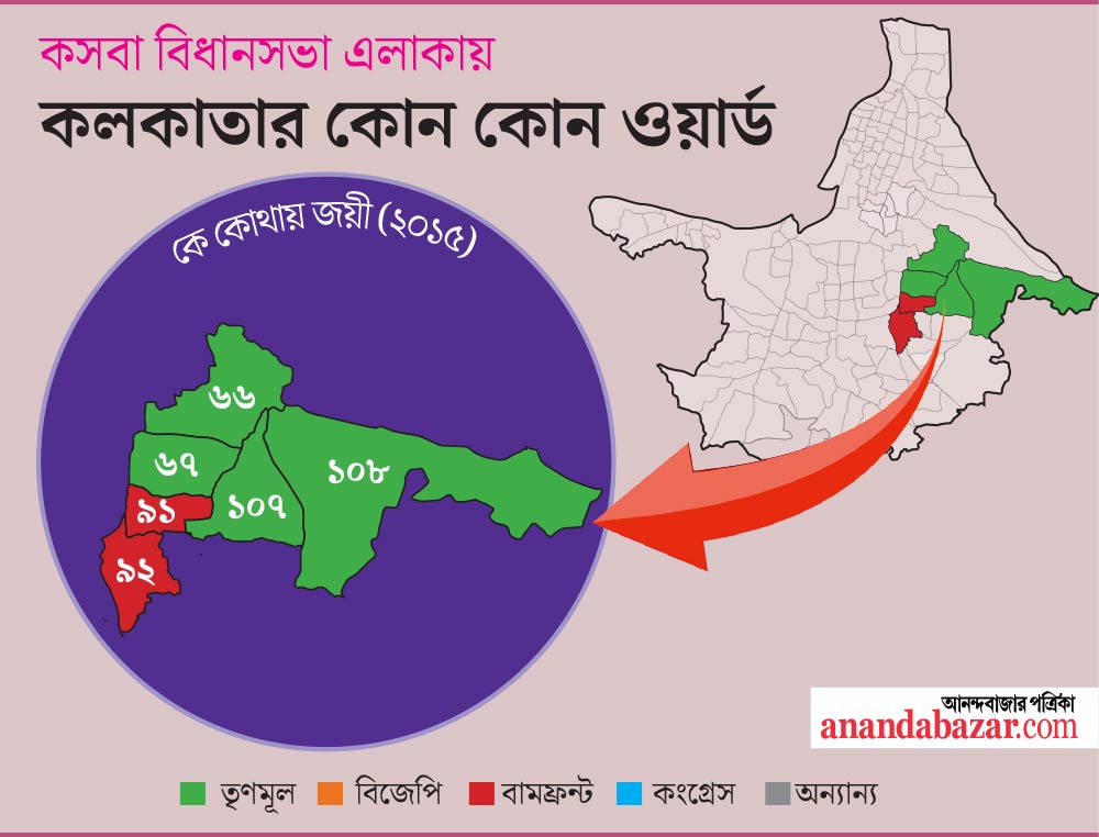 আরও একটি বিষয় উল্লেখযোগ্য— কলকাতা পুরসভা এলাকার মধ্যে সবচেয়ে বেশি ভোটার রয়েছেন কসবা বিধানসভার অন্তর্গত ৬৬ নম্বর ওয়ার্ডে। এখনও প্রতিবেশী দুই কেন্দ্র যাদবপুর ও কসবায় বামমনস্ক ভোটারদের বাস রয়েছে যথেষ্ট। এখনও ওই বিধানসভার ৯১ এবং ৯২ নম্বর ওয়ার্ড ধরে রেখেছে বামফ্রন্ট। ৯১ নম্বর ওয়ার্ডের বিদায়ী কো-অর্ডিনেটর সিপিএমের অন্নপূর্ণা দাস। আর ৯২ নম্বর ওয়ার্ডে সিপিআইয়ের মধুছন্দা দেব। ৯১ নম্বর ওয়ার্ডে নতুনমুখ সুরজিৎ সেনগুপ্তকে প্রার্থী করেছে সিপিএম। সেই ওয়ার্ড সিপিএমের থেকে ছিনিয়ে নিতে পাশের ওয়ার্ড ৯০ নম্বর থেকে এসে প্রার্থী হয়েছেন তৃণমূলের পরিচিত মুখ বৈশ্বানর চট্টোপাধ্যায়। আর ৯২ নম্বর ওয়ার্ডে বর্ষীয়ান সিপিআই নেত্রী তথা বামপ্রার্থীর বিরুদ্ধে প্রার্থী হয়েছেন তৃণমূলের ‘নতুন মুখ’ অভিষেক মুখোপাধ্যায় (রোহন)। কসবা বিধানসভার এই দুটি ওয়ার্ড ছাড়া বাম বা বিরোধীরা কোনও ওয়ার্ডে লড়াইয়ে নেই বললে অত্যুক্তি হবে না।