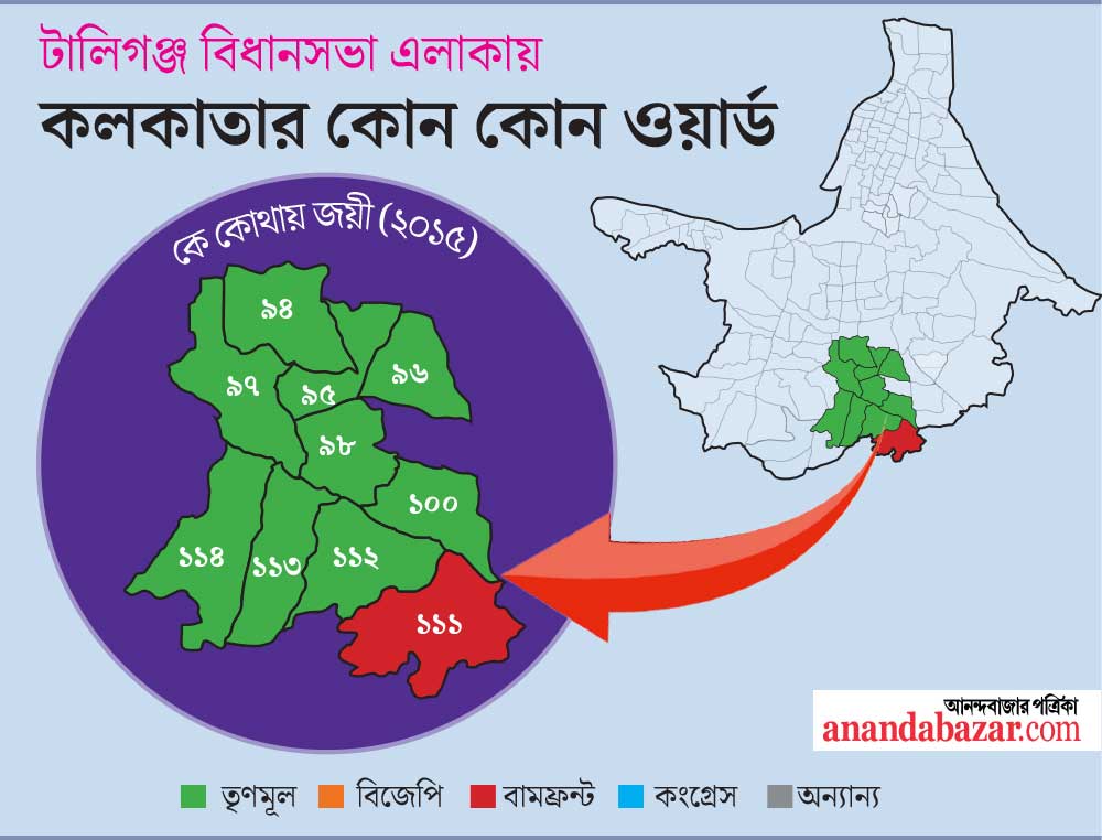 এখন টালিগঞ্জ বিধানসভা কলকাতা পুরসভার ন’টি ওয়ার্ড নিয়ে। কলকাতা পুরসভার ৯৪, ৯৫, ৯৭, ৯৮, ১০০, ১১১, ১১২, ১১৩ এবং ১১৪ নম্বর ওয়ার্ড নিয়ে টালিগঞ্জ। এই বিধানসভা কেন্দ্রের ৯৮ এবং ১১১ নম্বর ওয়ার্ড দুটি এখনও সিপিএমের দখলে। এ বারের পুরভোটে এই দুটি ওয়ার্ড জিততে ১১০ নম্বর ওয়ার্ড থেকে কাউন্সিলর অরূপ চক্রবর্তীকে প্রার্থী করে আনা হয়েছে। ১১১ নম্বর ওয়ার্ডে শাসকদলের প্রার্থী হয়েছেন সন্দীপ দাস। দক্ষিণ কলকাতা জেলা তৃণমূলের এক ‘প্রভাবশালী’ নেতার কথায়, ‘‘টালিগঞ্জ বিধানসভার ৯৮ এবং ১১১ নম্বর ওয়ার্ড দু’টি কঠিন জায়গায় রয়েছে। সেখানকার বাম কাউন্সিলররা এলাকায় জনপ্রিয়। তাই ওই দু’টি ওয়ার্ডের জন্যই আমাদের বেশি ঘাম ঝরাতে হবে।’’