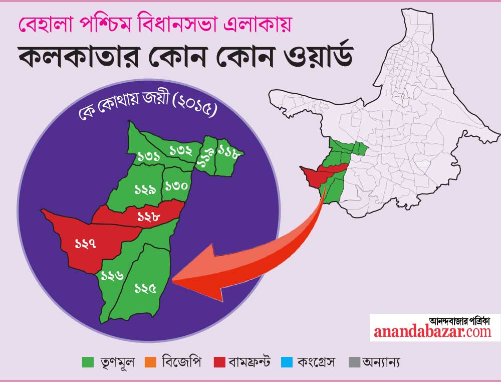 ২০১০ সালের পুরভোটে বামপন্থীদের হটিয়ে পার্থের বিধানসভা কেন্দ্রের ওয়ার্ডগুলির দখল নিয়েছিল তৃণমূল। ২০১৫ সালে পূর্ব বেহালায় বামেরা দাঁত ফোটাতে না পারলেও বেহালা পশ্চিমের দু’টি ওয়ার্ড পুনরুদ্ধার করে সিপিএম। ১২৭ এবং ১২৮ নম্বর ওয়ার্ডে এখনও সিপিএমের কো-অর্ডিনেটররা রয়ে গিয়েছেন। গত বিধানসভা ভোটে ৫০ হাজারের বেশি ভোটে জয় পেয়েছেন পার্থ। তাঁর বিধানসভার অধীন ১০টি ওয়ার্ডেই ‘লিড’ রয়েছে তাঁর। কিন্তু মাত্র দু’টি ওয়ার্ডে ভর করেই সিপিএম পেয়েছে ৪৭ হাজার ভোট। ৬৩ হাজার ভোট পেয়ে দ্বিতীয় স্থানে উঠে এসেছে বিজেপি। রাজ্যে বিজেপি প্রধান বিরোধী দল হিসেবে আত্মপ্রকাশ করলেও পার্থের কেন্দ্রে পুরভোটে এখনও ‘ফ্যাক্টর’ কিন্তু বামেরাই।