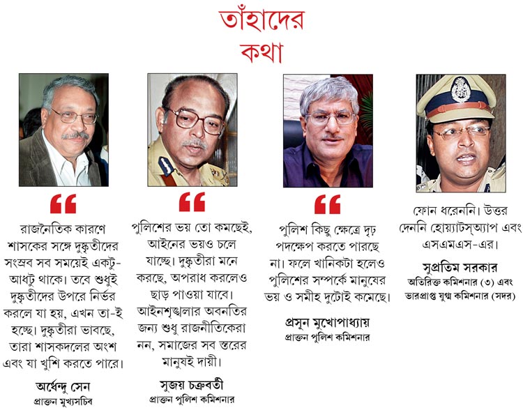 লালবাজারের কর্তাদের কয়েক জন জানিয়েছেন, এই ধরনের পুলিশি ব্যবস্থা এক দিনে গড়ে ওঠেনি। বরং উচ্চপদস্থ কর্তারাই দিনের পর দিন বাহিনীকে ঠুঁটো করে রেখেছেন। শহরের দুষ্কৃতী দমনে বিশেষ ভাবে দক্ষ গোয়েন্দা বিভাগের গুন্ডাদমন শাখাও ‘শান্ত’ হয়ে গিয়েছে। তার ফলেই দুষ্কৃতীদের সাহস এত বেড়েছে। পরিস্থিতি এমন জায়গায় গিয়েছে যে, আমজনতা তো কোন ছার, উর্দিধারীদেরও রেয়াত করা হচ্ছে না। উল্টে পুলিশের কাজে রাজনৈতিক হস্তক্ষেপকে পরোক্ষে প্রশ্রয় দেওয়া হয়েছে।