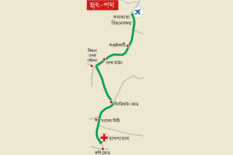 সকাল ১১টা ৯ মিনিট: হৃৎপিণ্ড নিয়ে বিমানবন্দর থেকে ‘গ্রিন করিডর’ ধরে আনন্দপুরের পথে ছুটল অ্যাম্বুল্যান্স।