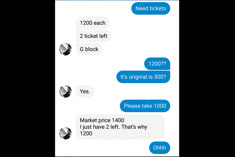 শুধু চড়া দামের টিকিটের বিজ্ঞাপনই নয়, সেই গ্রুপে যখন-তখন পড়ছে টিকিটের দাবিও। যেমন এ দিনের ম্যাচের ছ’টি টিকিট চাই এক যুবকের। পরপর সিটের টিকিট মিলবে কি না, তা জানতে চেয়ে পোস্ট করে দিয়েছেন তিনি। সেই পোস্টের উত্তরও এসেছে সঙ্গে সঙ্গে। ৫০০ টাকার টিকিটের দাম কেউ হেঁকেছেন ১৫০০, আবার কেউ কম দামে দিচ্ছেন দাবি করে, এক-একটির দাম চেয়েছেন ১০০০ করে।