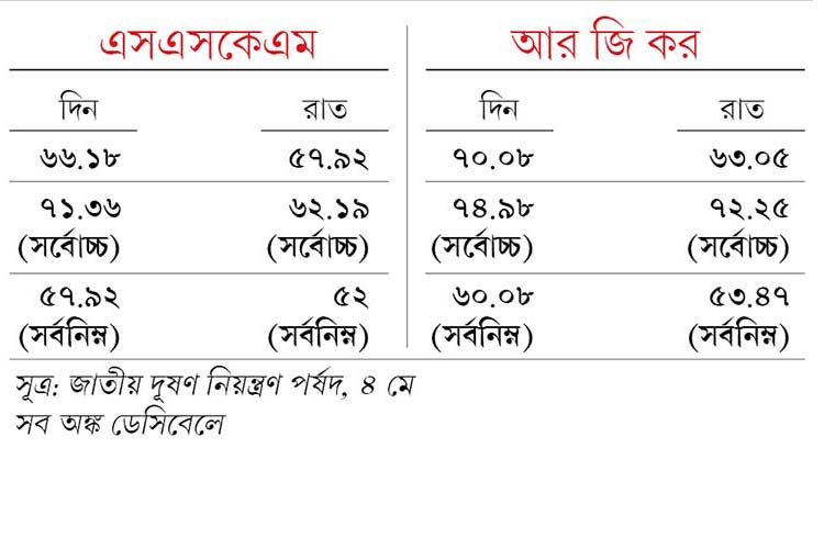 শব্দমাত্রা পরিমাপের জন্য কেন্দ্রীয় ও রাজ্য দূষণ নিয়ন্ত্রণ পর্ষদের যৌথ উদ্যোগে শহরের বিভিন্ন এলাকায় ১০টি শব্দ পরিমাপক যন্ত্র লাগানো হয়েছে। আর জি কর এবং এসএসকেএমেও রয়েছে এমন দু’টি যন্ত্র। পরিসংখ্যান বলছে, এই দু’টি হাসপাতাল চত্বরে দিনে শব্দের গড় পরিমাপ ৭০ ডেসিবেলের কাছাকাছি। সময়ে সময়ে যা আরও বেড়ে যায়। অর্থাৎ, সাইলেন্স জ়োনের শব্দাঙ্কের চেয়ে সংখ্যাটি ২০ ডেসিবেলেরও বেশি। অন্য দিকে, রাতে শব্দাঙ্ক গড়ে প্রায় ৬০ ডেসিবেল। কখনও যা ৬৪ ডেসিবেল ছুঁয়ে ফেলে।