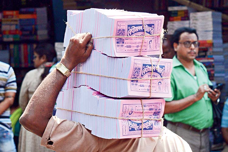 পঞ্জিকা কাঁধে যাত্রা। শুক্রবার, কলেজ স্ট্রিটে।