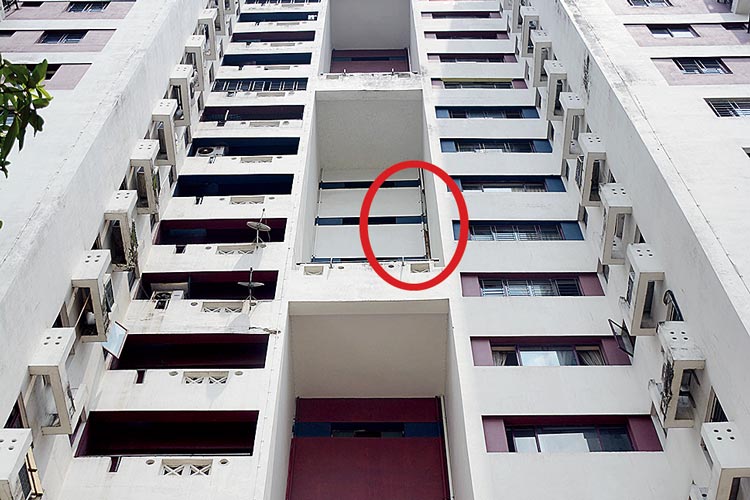 আবাসনের এই উচ্চতা থেকেই ভেঙে পড়ে মরচে ধরা পাইপের অংশ। বৃহস্পতিবার, সার্ভে পার্ক এলাকার একটি আবাসনে।