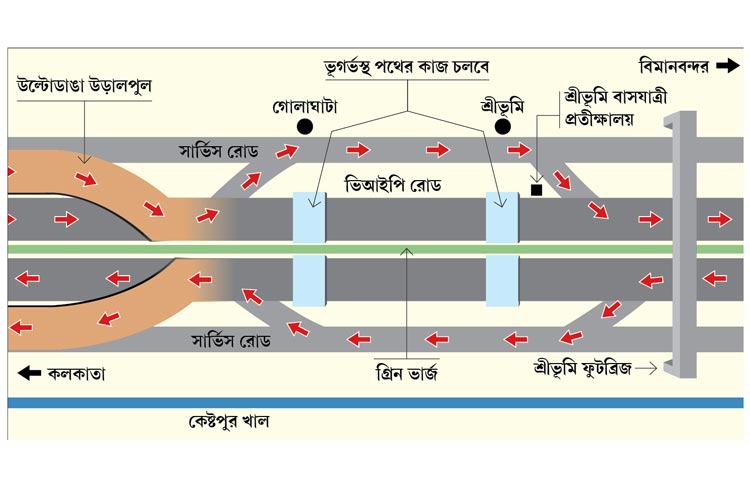 পূর্ত দফতর সূত্রের খবর, দু’টি ভূগর্ভস্থ পথের সিঁড়ি তৈরির কাজ আংশিক সম্পন্ন হয়েছে। এখন ভিআইপি রোডের মাঝের অংশে বাক্সের মতো কাঠামো নির্মাণে রাস্তার মধ্যবর্তী অংশ খোঁড়া হবে।