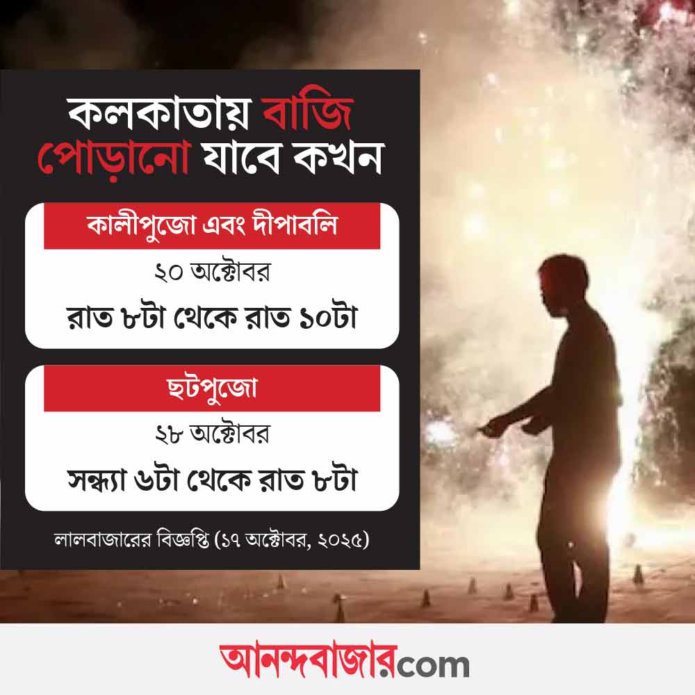 তবে শুধু কালীপুজোই নয়, ছটপুজোর জন্যেও একই রকম নিষেধাজ্ঞা জারি হয়েছে। লালবাজার জানিয়েছে, আগামী ২৮ অক্টোবর, ছটপুজোয় সন্ধ্যা ৬টা থেকে রাত ৮টা পর্যন্ত সবুজ বাজি পোড়ানো যাবে।