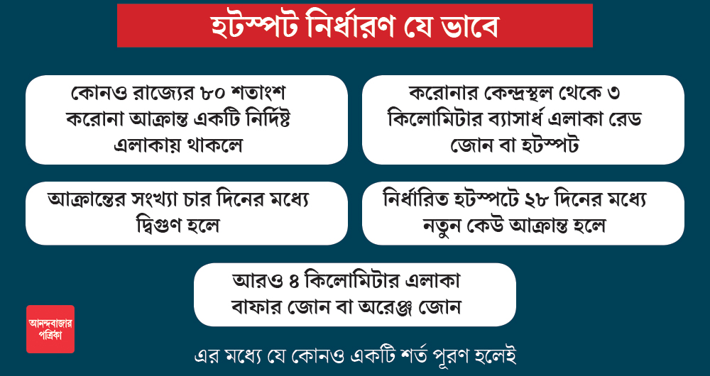 • হটস্পট (রেড জোন)-এর ‘লার্জ আউট ব্রেক’ অর্থাৎ যেখানে বেশি মানুষ সংক্রমিত হয়েছেন, সেই তালিকায় নাম রয়েছে কলকাতার। একই সঙ্গে রয়েছে হাওড়া, পূর্ব মেদিনীপুর এবং উত্তর ২৪ পরগনা জেলাও। বিশেষ গুরুত্ব দেওয়া হচ্ছে এই জেলাগুলিতে।