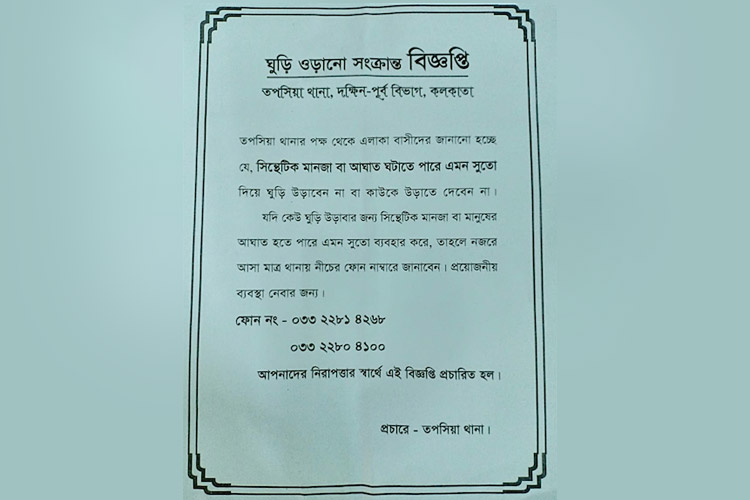 এই বিপদ থেকে রক্ষা পেতে এক দিকে যেমন সেতুর রেলিংয়ের উপরে জাল লাগানোর পরিকল্পনা নিয়েছে কলকাতা পুলিশ, তেমনই পার্ক সার্কাস, তিলজলা, তপসিয়া থানা এলাকায় সচেতনা প্রচারের উপরও জোর দিচ্ছে লালবাজার। শুক্রবার তোপসিয়া থানা এলাকায় এ বিষয়ে একটি লিফলেট বিলি করা হয়েছে। তাতে চিনা বা সিন্থেটিক মাঞ্জা নিয়ে পরামর্শ দেওয়া হয়েছে। ওই মাঞ্জা কেউ ব্যবহার করলে, যেন পুলিশকে খবর দেওয়া হয়, সেই অনুরোধ করা হয়েছে।