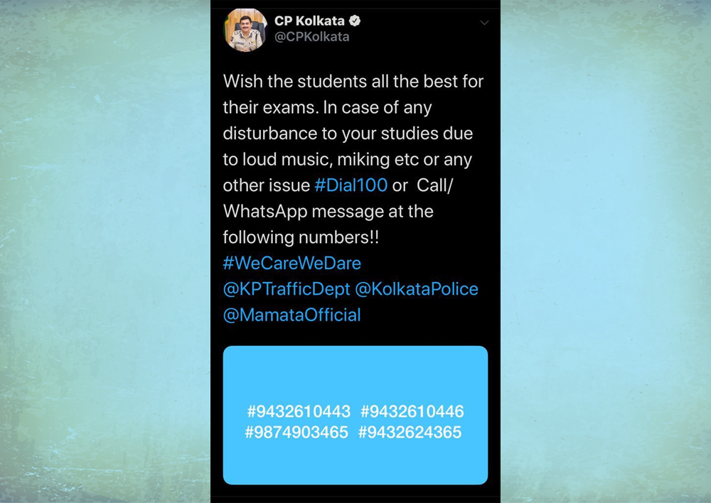 এ বিষয়ে খোদ কলকাতার পুলিশ কমিশনার অনুজ শর্মা টুইট করে পরীক্ষার্থীদের পাশে থাকার বার্তা দিয়েছেন। তিনি ফেসবুক এবং টুইটারের মাধ্যমে জানিয়েছেন, ‘‘পরীক্ষার্থীদের জন্যে শুভেচ্ছা রইল। মাইকিং অথবা তারস্বরে গান বাজানোর কারণে পড়াশোনায় সমস্যা হলে ১০০ ডায়ালে ফোন করুন। এ ছাড়াও আরও চারটি নম্বরে হোয়াটসঅ্যাপে অভিযোগ জানানো যাবে।’’