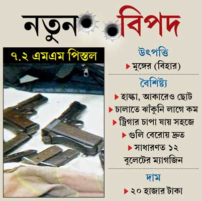 এ প্রসঙ্গে উঠে আসছে অপরাধ-জগতে হাতিয়ারের বিবর্তনের ছবিও। প্রবীণ অফিসারেরা জানাচ্ছেন, একটা সময়ে দুষ্কৃতীরা খুন-জখম বা ভয় দেখাতে মূলত ওয়ান শটার বা পাইপগান ব্যবহার করত, তিন-চার রাউন্ড চালিয়েই ভাবত, যথেষ্ট হয়েছে। পাণ্ডা গোছের কেউ হয়তো রিভলভার রাখত। নাইন এমএম পিস্তলধারী তো রীতিমতো ‘ডন’-এর মর্যাদা পেত। এক অফিসারের কথায়, ‘‘২০০৭-এর জানুয়ারিতে শিয়ালদহ ফ্লাইওভারের নীচে এক ব্যবসায়ী নাইন এমএমের গুলিতে ঝাঁঝরা হয়ে যান। স্থানীয় এক দাগির খোঁজ পড়ে। সে পরিষ্কার বলল, ওটা আমার কাজ নয়। আমার ও সব অটোম্যাটিক-ফ্যাটিক লাগে না। যা করেছি, সব ওয়ান শটার দিয়ে।’’