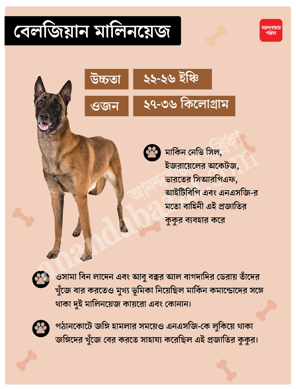 মার্কিন প্রেসিডেন্টের নিরাপত্তা বাহিনীতে যে বিশেষ প্রশিক্ষিত কুকুর বাহিনী রয়েছে, সেই একই প্রজাতির কুকুরকে এ বার দেখা যাবে নবান্নের প্রহরাতেও। কলকাতা পুলিশ সূত্রে খবর, শহরে যে কোনও জঙ্গি হানার বিরুদ্ধে লড়াই করার জন্য যে বিশেষ সারমেয় বাহিনী তৈরি করা হচ্ছে, তাতে শামিল করা হবে বেলজিয়ান মালিনয়েজ ওরফে মালিনওয়াঁ প্রজাতির কুকুরকেও।