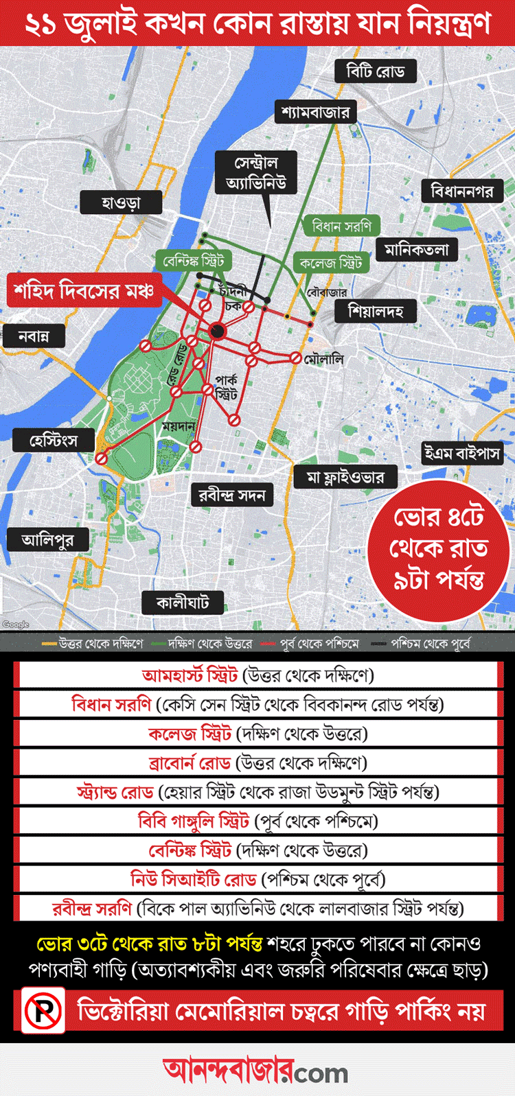 কলকাতার পুলিশ কমিশনার (সিপি) মনোজ বর্মার তরফে প্রকাশিত বিজ্ঞপ্তিতে জানানো হয়েছে, ২১ জুলাই ভোর ৪টে থেকে রাত ৯টা পর্যন্ত বেশ কিছু রাস্তায় যাত্রিবাহী যান চলাচল নিয়ন্ত্রণ করা হবে। এই রাস্তাগুলি হল আমহার্স্ট স্ট্রিট (উত্তর থেকে দক্ষিণমুখী যান চলাচল করা হবে), বিধান সরণি (কেসি সেন স্ট্রিট থেকে বিবকানন্দ রোড পর্যন্ত যান নিয়ন্ত্রণ), কলেজ স্ট্রিট (দক্ষিণ থেকে উত্তরমুখী যান নিয়ন্ত্রণ), ব্রাবোর্ন রোড (উত্তর থেকে দক্ষিণে), স্ট্র্যান্ড রোড (হেয়ার স্ট্রিট থেকে রাজা উডমুন্ট স্ট্রিট পর্যন্ত), বিবি গাঙ্গুলি স্ট্রিট (পূর্ব থেকে পশ্চিমে), বেন্টিঙ্ক স্ট্রিট (দক্ষিণ থেকে উত্তরে), নিউ সিআইটি রোড (পশ্চিম থেকে পূর্বে) এবং রবীন্দ্র সরণি (বিকে পাল অ্যাভিনিউ থেকে লালবাজার স্ট্রিট পর্যন্ত)।