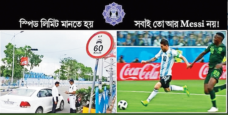 কলকাতা পুলিশের টুইটার, ফেসবুকের প্রধান চরিত্র এখন বিশ্ব ফুটবলের এই মহাতারকারাই। কখনও ট্র্যাফিক সিগন্যালের সঙ্কেত বা হেলমেট দেখিয়ে টুইট করা হচ্ছে, ‘সাবধানের নেইমার’, কখনও বা মেসির দৌ়ড়ের ছবি ও রাস্তায় গাড়ির ছবি দেখিয়ে টুইট হচ্ছে, ‘স্পি়ড লিমিট মানতে হয়, সবাই তো আর মেসি নয়’। কখনও মেসির পেনাল্টি মিসকে ট্রোল করে বলা হচ্ছে, কলকাতার রাস্তায় আইন ভাঙলে জরিমানার ছা়ড় নেই। যা দেখে নেট দুনিয়ার নাগরিকেরা বলছেন, সোশ্যাল মিডিয়ায় বিশ্বকাপ জ্বরে কাবু লালবাজারও।
