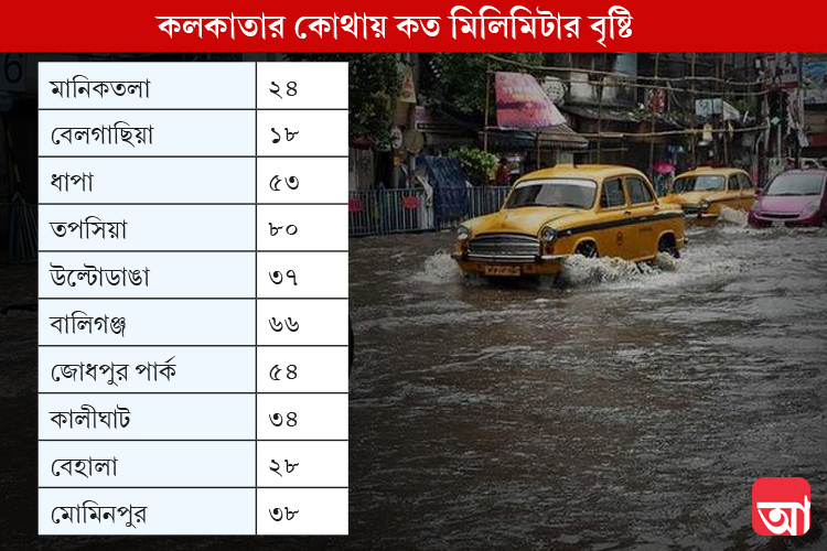 উল্টোডাঙা, পার্ক সার্কাস, ঠনঠনিয়া কালীবাড়ি, হেস্টিংস, বেহালা থেকে শুরু করে ধাপা, সায়েন্স সিটি, গড়িয়া, যাদবপুর, খিদিরপুর-সহ শহরের প্রায় সর্বত্রই বৃষ্টিতে থই থই অবস্থা।