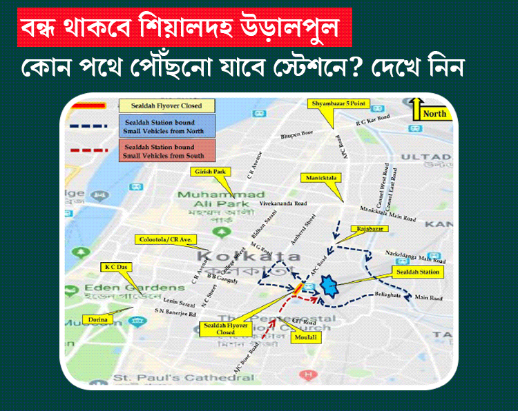পুরো নয়, আংশিক বন্ধ রেখেই স্বাস্থ্য পরীক্ষা করা হবে শিয়ালদহ উড়ালপুল(বিদ্যাপতি সেতু)-এর। উড়ালপুলের পূর্ব এবং পশ্চিমের দু’টি বাহু সচল রাখা হবে যাতে শিয়ালদহ স্টেশনে পৌঁছতে অসুবিধা না হয় যাত্রীদের। তবে বন্ধ থাকবে উত্তর-দক্ষিণে বিস্তৃত উড়ালপুলের মূল অংশটির ঠিক মাঝের অংশ।