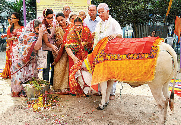 শহর কলকাতায় আইন অনুযায়ী গোশালা বা খাটাল নেই, তা হলে গোপাষ্টমী (এ বারে ৮ নভেম্বর) পালিত হবে কী করে? কথিত আছে, বালক শ্রীকৃষ্ণ এই দিন প্রথম সুদামা সহ অন্য বন্ধুদের সঙ্গে গো-চারণে গিয়েছিলেন। সেই থেকেই এই দিনে শুদ্ধ বস্ত্র পরে গরুকে প্রতীকী স্নান করিয়ে তিলক-ফুল-মালায় সাজিয়ে গুড়, ভুষি, শাকসবজি ও টাটকা ঘাস খাওয়ানোর রীতি। কলকাতা পিঁজরাপোল সোসাইটি বেশ কয়েক বছর ধরেই এখানে এ কাজে উদ্যোগী। সংস্থার সাধারণ সম্পাদক পুরুষোত্তম পরশরামপুরিয়া জানালেন, ‘কলকাতায় পঁয়ষট্টিটি ও হাওড়ায় এগারোটি জায়গায় ১/২টি গরু ও তার পালককে এই জন্যই নিয়ে আসা হবে।’ ‘কলকাতায় সব থেকে ভাল বন্দোবস্ত হয় লেক কালীবাড়ির সামনের প্রাঙ্গণে,’ জানালেন সেবায়েত নিতাইচন্দ্র বসু। সঙ্গে তারই ছবি।