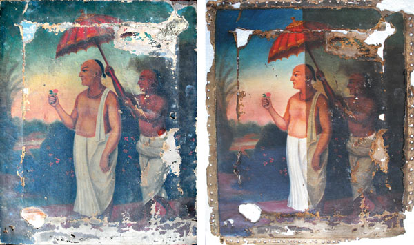 এটা শুধুমাত্র ছবির প্রদর্শনীই নয়, ইতিহাসকে ছোঁয়াও! ‘আর্লি বেঙ্গল স্কুল’ থেকে শুরু করে হেমেন মজুমদার, অতুল বসু, এমনকী যামিনী রায়ের ছবিও চিত্রকূট আর্ট গ্যালারিতে ‘রেস্টোর্ড ট্রেজার্স’ শীর্ষক প্রদর্শনীতে দেখা যাচ্ছে (চলবে ১০ জানুয়ারি পর্যন্ত, রোজ ৩-৮টা)। প্রদর্শিত সাতাশটি ছবির মধ্যে বেশ কিছু দুষ্প্রাপ্য ছবিও আছে। যেমন, রাজা নবকৃষ্ণ দেবের সেই বিখ্যাত ছবি। প্রদর্শনীটি কিউরেট করেছেন ‘শিল্প সংরক্ষণ’-এ অভিজ্ঞ উদ্ধৃতি দাস। ব্রিটেনের টেট থেকে শিখে আসা শিল্পীর মতে, ‘জলরঙের ছবির চেয়ে তেল রঙের ছবির সংরক্ষণ করা সহজ। কেননা, তেল রঙের ছবি আঁকার অনেকগুলি ধাপ থাকে। আস্তে আস্তে সেই সব ধাপ পেরিয়ে শেষ পর্যন্ত ছবিটিকে সংরক্ষণ করে রাখা যায়।’ তিনি রাধাকৃষ্ণের একটি সংরক্ষিত ছবি দেখালেন, যে ছবিটি অনেকগুলো টুকরো হয়েছিল। এখন সংরক্ষিত হওয়ার পরে একটি পূর্ণ ছবির মাত্রা পেয়েছে।