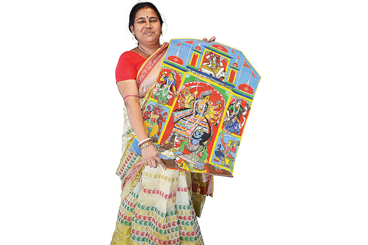 বিষ্ণুপুরে মল্ল রাজপরিবারে ‘মৃন্ময়ী’ দেবীর নিয়মিত পুজোর সঙ্গে দুর্গাপুজোর সময় পুজো হয় তিনটি ঠাকুরানি পটের। আর গোপনে পূজিতা হন দেবী খচ্চরবাহিনী, তা-ও পটে। একই ভাবে, বাঁকুড়া জেলারই জামকুড়িতে মল্ল রাজপরিবারের শাখায় নিত্যপুজো হয় ‘রাজরাজেশ্বরী’ রূপে দুর্গার। সেখানেও আছে পটের পুজো। তিন ঠাকুরানি ছাড়াও নবমী তিথির গভীর রাতে খচ্চরবাহিনী মহামারি পটপুজো হয় গোপনে। সে পট আঁকতে শিল্পীদের নানা আশঙ্কা, দ্বিধা। তবু জীর্ণ সেই পট বদলে নতুন করে তৈরিতে সাহস করে এগিয়ে এলেন শিল্পী পরিবারের গৃহবধূ কৃপাময়ী কর্মকার। জামকুড়ির তিনটি ঠাকুরানি পট অবশ্য আঠারো বছর ধরে তিনিই আঁকছেন। পরম্পরাগত অনুশীলন ও শিক্ষা শ্বশুর নিতাই কর্মকারের কাছে। বাঁকুড়ার পাত্রসায়র এলাকার বনবীরসিংহ গ্রামের এই মহিলাশিল্পী তিনটি দুর্গাপট ছাড়া নিজের গ্রামের কালীপুজোয় হরহরি পট ও অন্য দুর্গাপটও তৈরি করেন প্রতি বছর। পূজার্চনাকেন্দ্রিক পট ছাড়াও অন্য বিষয় ভাবনায় বছর কয়েক ধরে আগ্রহী হয়ে উঠছেন। আঁকছেন শ্রীরাধার বারোমাস্যা, দশাবতার, রাসলীলা, সত্যপিরের জন্মকাহিনি, নবনারীকুঞ্জর ইত্যাদি নানা পট। স্বামী গোপাল কর্মকার এই শিল্পধারায় ওয়াকিবহাল হলেও পেশা ভিন্ন। তাই আদি মল্লভূমের বিষ্ণুপুরের পটচিত্রধারার বাইরে স্বতন্ত্র রূপ এগিয়ে নিয়ে চলেছেন বিয়াল্লিশ বছরের কৃপাময়ী। দিল্লি, মহীশূর, ভুবনেশ্বরের প্রদর্শনীতে যোগ দিয়েছেন। কিন্তু কলকাতায় এলেন এই প্রথম। ক্রাফ্‌টস কাউন্সিল অব ওয়েস্ট বেঙ্গলের সুবর্ণজয়ন্তীতে কলকাতা সেন্টার ফর ক্রিয়েটিভিটির গ্যালারিতে পট-বিষয়ক প্রদর্শন-কর্মশালায়। বাংলার পটের দুর্গার শিল্পবৈশিষ্ট্য আর বিষয়ভিত্তি প্রসঙ্গে পটের কাঠামো, প্রাকৃতিক রং দেখিয়ে নিজের শিল্পসৃজন নিয়ে মতবিনিময়ও করলেন স্বচ্ছন্দে।