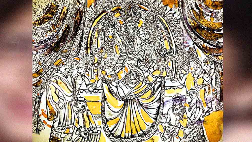 দুর্গাপুজোকে কেন্দ্র করে কলকাতায় শিল্প চর্চার যে বিরাট পরিসর, তার উৎস সন্ধানে নিশ্চিত ভাবেই উঠে আসে শোভাজারের নবকৃষ্ণ দেবের পুজোর কথা। ঐতিহ্যের টানেই আজও পুজোয় নবকৃষ্ণ স্ট্রিটে দেব বাড়ির ঠাকুরদালান দু’টি অমোঘ গন্তব্য। ২৬৩ বছরের পুরনো সেই ইতিহাসের সঙ্গে সাক্ষাতের সুযোগ আবারও, পুজোর আগেই। প্রাচীন এ পুজোর কিছু বিশেষ মুহূর্তকে কেন্দ্রে রেখে পরিবারের সদস্য, শিল্পী প্রবীর কৃষ্ণ দেবের আঁকা একগুচ্ছ ছবি (নীচে তারই একটি) নিয়ে একটি গ্রন্থনির্মাণের প্রাথমিক চিন্তা থেকে যে পরিকল্পনার শুরু, তা-ই রূপ পেয়েছে দুর্গাপূজা অ্যাট শোভাবাজা রাজবাড়ি: আ ট্রিস্ট উইথ হিস্ট্রি অ্যান্ড হেরিটেজ নামের প্রদর্শনী ও উৎসবে— ‘ঋতবাক’ প্রকাশনীর প্রত্যক্ষ ভাবনায়, শিল্প সংস্থা ‘কলকাতা সেন্টার ফর ক্রিয়েটিভিটি’ (কেসিসি)-র রূপায়ণে। ছবি ও ছবির গল্প দিয়ে সাজানো সুদৃশ্য বই শোভাবাজার রাজবাড়ির দুর্গাপূজা প্রকাশ করেছে ‘ঋতবাক’। প্রদর্শনীতে দেখা যাবে মূল অলঙ্করণগুলি, পাশাপাশি এক গুচ্ছ অনুষ্ঠান: চণ্ডীপাঠ, আলোচনা, বৈঠকি আড্ডা, সাংস্কৃতিক অনুষ্ঠান, রান্না। উৎসব শুরু আজ, ২৫ সেপ্টেম্বর, বিকেল ৪টায়। কেসিসি-তে প্রদর্শনী ৫ অক্টোবর পর্যন্ত, কোভিডবিধি মেনে রোজ সকাল ১১টা থেকে সন্ধে ছ’টা।