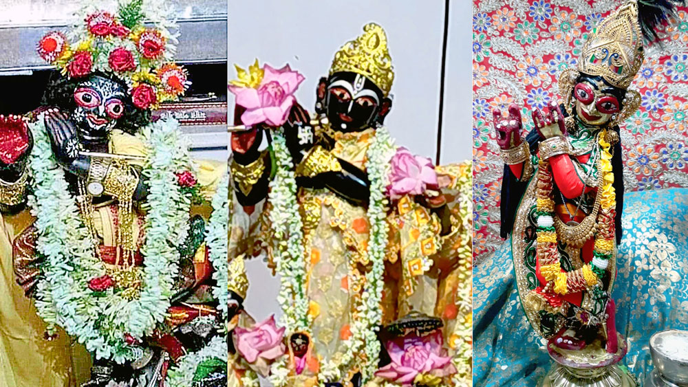 জন্মাষ্টমী এক দেবশিশুর জন্মের আনন্দোৎসব। সেই আনন্দ প্রকাশেরও বিশেষ রীতি খড়দহের শ্যামসুন্দর মন্দিরে। শ্যামসুন্দরকে (ছবিতে মাঝখানে) নবজাতকের মতো কোলে করে ভক্তদের মধ্যে নিয়ে আসা হয়। সবার দর্শনানন্দের পর, বিগ্রহকে নতুন পোশাক পরিয়ে শুরু হয় পুজো, জানালেন গবেষক কৌশিক দত্ত।