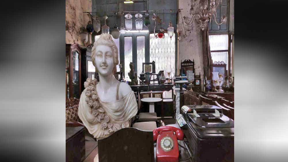 উঁচু খিলানওয়ালা, পলস্তারা-খসা দেয়ালের বিরাট ঘরটায় ঢুকতেই বোঝা যায়, আগেকার কৌলীন্য এখন অতীত। রাসেল স্ট্রিটের নিলামঘর ‘দ্য রাসেল এক্সচেঞ্জ’ টিকে থাকার লড়াইটুকু করে চলেছে অতিমারির এ শহরে। নানা ডিজ়াইনের অফিস-আসবাব, তার মধ্যেই ঝিমোচ্ছে পুরনো আমলের আরামকেদারা। বাজারচলতি সস্তা জিনিসই নিলাম সামগ্রী— ডায়েরি, অ্যাশট্রে, টেলিফোন, পেয়ালা-পিরিচ, ছিন্নপত্র ম্যাগাজ়িন, গল্প-প্রবন্ধের বই। অন্য দিকে থমকে অতীত— ঝাড়বাতি, বর্মা টিকের আলমারি, চিনেমাটির প্লেট, আয়না বসানো ড্রেসিং টেবিল, পোর্সেলিনের পুতুল, পাথরের মূর্তি (নীচের ছবিতে)। ধুলো ঝাড়া হয় ‘পিরিয়ড পিস’-এর, ‘অ্যান্টিক’ মেলে না আর। এখন ছবির শুটিংয়ে ভাড়া খাটে জিনিস, নিলামঘরটাও। আর শহরের কোনও পুরনো বাড়ি ভাঙা পড়লে খবর আসে দোকানে। ছবি: তথাগত সিকদার