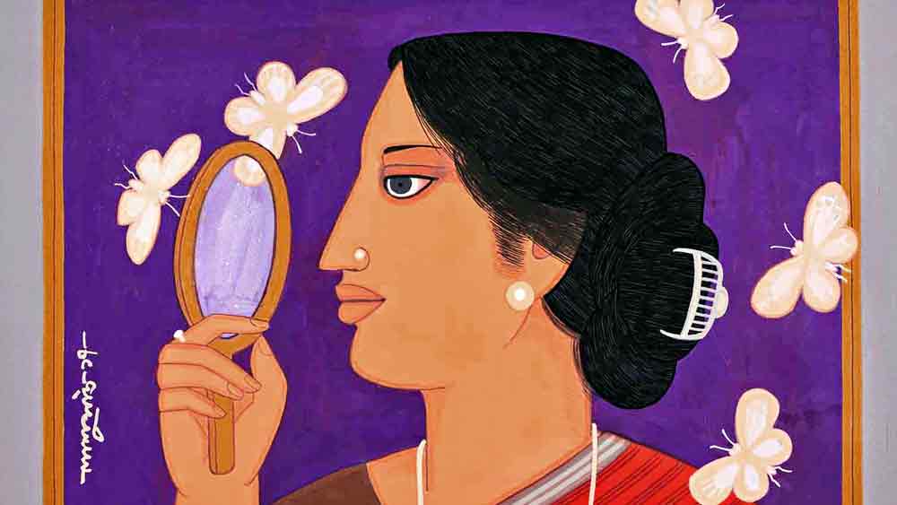 ছয় শিল্পীর আঁকা ছবি, প্রত্যেকেরই বিষয়— নারী। নারীমুখ বললে স্পষ্ট হয় আরও। তবে প্রতিটি শিল্পকৃতির রস ও রহস্য আলাদা, েসখানেই শিল্প-অভিজ্ঞতারও বৈচিত্র। কে জি সুব্রহ্মণ্যম, যোগেন চৌধুরী, রামানন্দ বন্দ্যোপাধ্যায়, লালুপ্রসাদ সাউ, রবীন মণ্ডল ও অরুণিমা চৌধুরী— বাংলার ছ’জন বিশিষ্ট চিত্রশিল্পীর কাজ নিয়ে ‘ইমামি আর্ট’ আয়োজন করেছে প্রদর্শনী ফেমিনিন ফ্যাসেটস, শুরু হয়েছে গত ২৫ জুন থেকে, চলবে সারা জুলাই মাস ধরে। তুলি ও কালির যুগলবন্দি কারও চিত্রকৃতিতে, লোকশিল্পের সঙ্গে ধ্রুপদী আঙ্গিক এসে মিশেছে কারও ছবিতে। কোনও ছবি যেন ঠিক মধ্যবিত্ত বাঙালি ঘরের নারীর অন্দরমহলের চিত্র, আবার কোথাও জীবন ও সভ্যতার জটিল প্রাগিতিহাসকেই যেন ধারণ করেছে নারী-অবয়ব। অতিমারি-ঢেউ থাবা বসিয়েছে গ্যালারিতে গিয়ে সামনে থেকে ছবি দেখার অভিজ্ঞতায়, এ প্রদর্শনী তাই আন্তর্জালিক, দেখা যাবে ইমামি আর্ট-এর ওয়েবসাইটে। ছবিতে লালুপ্রসাদ সাউয়ের চিত্রকৃতি উওম্যান উইথ বাটারফ্লাইজ় (২০১৭)।