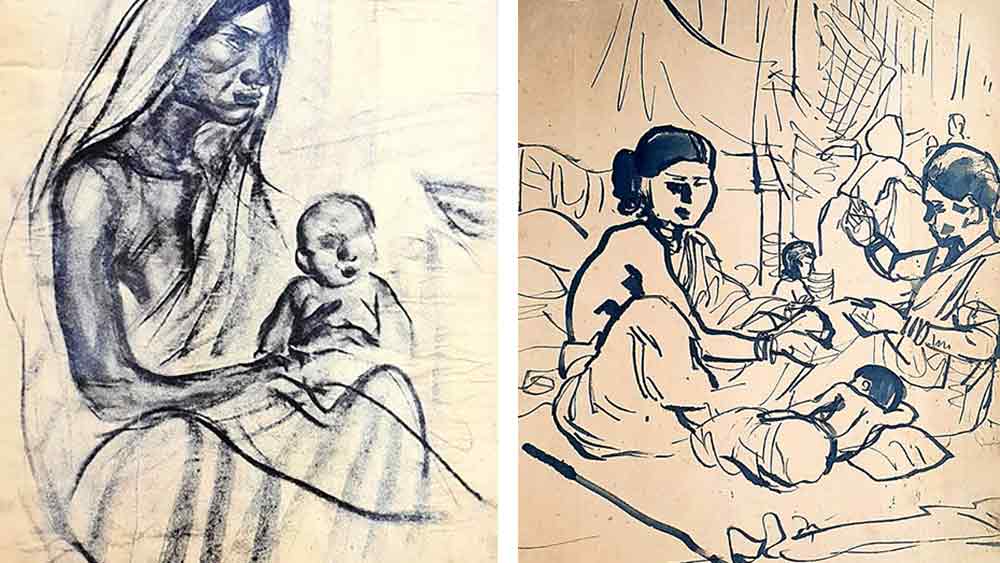 আর্ট কলেজে পড়ার সময় একটা গুরুত্বপূর্ণ কাজ হল ফিগার স্কেচ করা, জনাকীর্ণ রেলস্টেশনে গিয়ে। কিন্তু সেই স্কেচের বিষয় যদি হয়ে ওঠে ও পার বাংলার উদ্বাস্তুস্রোতের নানা মুখ, সময়টা যদি হয় স্বাধীনতার পরের দশক, আর শিল্পীর নাম যদি হয় যোগেন চৌধুরী, আজকের সময়ে দাঁড়িয়ে সে তা হলে এক ইতিহাসকেই ফিরে দেখা। ১৯৫৮ থেকে ১৯৬৮, শিয়ালদহ স্টেশনে তখনও শরণার্থীর ভিড়। কলেজে পড়ার সময় তো বটেই, হাওড়া জেলা স্কুলে শিক্ষকতার সময়েও স্কুল ছুটির পর সোজা স্টেশন, কাগজ, পেনসিল, কালিকলম, চারকোল নিয়ে— বসে পড়তেন সেই সব অনিকেত মানুষের ভিড়ে। ছবিতে ফুটে উঠত সন্তান কোলে মা, ঘুমন্ত শিশুর পাশে জেগে থাকা মা (ছবিতে), অগণিত ছেলে-বুড়ো-কিশোরীর আশা-হতাশার দোলাচল, শেকড় ছেড়ে এসে নতুন ঠাঁই পাতার স্বপ্ন আর স্বপ্নভঙ্গের রোজনামচা। ষাট বছর বা তারও আগে আঁকা এই সব স্কেচের প্রায় সবগুলিই এখনও আছে শিল্পীর ব্যক্তিগত সংগ্রহে, নীচে ডান দিকের ছবিটি আছে অমৃতসরে পার্টিশন মিউজ়িয়ামে। স্বাধীনতার ৭৫ বছরে বাংলার বরেণ্য শিল্পীর চোখে দেখা দেশভাগের এই বাস্তবতা শৈল্পিক তো বটেই, ঐতিহাসিকও। ছবি সৌজন্য: যোগেন চৌধুরী