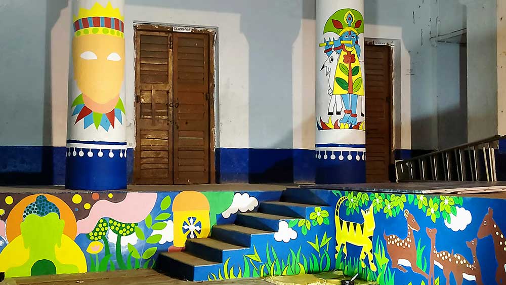 করোনাকালে মাসের পর মাস ক্লাসরুম, ল্যাব, লাইব্রেরির পাশে মনখারাপের ধুলো জমছিল বাড়িতে— বন্ধু, মাস্টারমশাই-দিদিমণিহীন রুটিনে। সরস্বতী পুজোর মুখে যখন নয় থেকে বারো ক্লাসের পড়ুয়াদের আনাগোনা শুরুর আর পুজোরও অনুমতি হল, উচ্ছ্বাস বাঁধ মানেনি কলকাতার সূর্য সেন স্ট্রিটের শতাব্দীপ্রাচীন মিত্র ইনস্টিটিউশন (মেন)-এর পড়ুয়া আর শিক্ষক-শিক্ষিকাদের। সরস্বতী পুজোর ক’দিন আগে থেকেই এগারো-বারো ক্লাসের ক’জন ছাত্র সকাল থেকে সন্ধে বসে পড়েছিল রঙের কৌটো, তুলি নিয়ে। ইস্কুলের সিঁড়ি, স্তম্ভ-সহ বহু জায়গা তাদের ছোঁয়ায় হয়ে উঠেছে চিত্রবিচিত্র (ছবিতে)। এ কাজে ওদের পথ দেখিয়েছেন আর্ট কলেজের দুই যুবা শিল্প-শিক্ষার্থী, আর পুরো কাজটির ভাবনা-প্রেরণা ঝাড়গ্রামের খোয়াবগাঁ, মাটির বাড়ির দেওয়ালে দেওয়ালে অপরূপ শিল্পকৃতির সেই গ্রাম। বুদ্ধ, বৃক্ষদেবতা, সবুজ বনে বাঘ আর হরিণের মিলমিশ ফুটে উঠেছে ছবিতে। সতত উৎসাহে সঙ্গে ছিলেন স্কুলের ভারপ্রাপ্ত শিক্ষক বিপ্লব নাহা বিশ্বাস-সহ সমস্ত শিক্ষক-শিক্ষিকা।