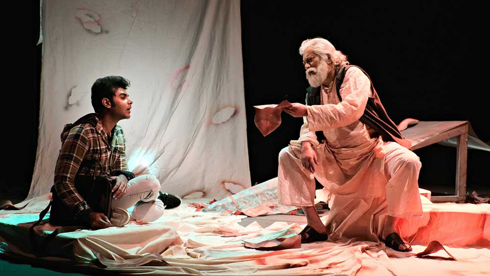 মরাঠি নাট্যকার সতীশ আলেকর-এর লেখা নাটক অবলম্বনে দেবেশ চট্টোপাধ্যায়ের নির্দেশনায় ‘সংসৃতি’ নাট্যদলের সাম্প্রতিক প্রযোজনা একদিন মন্দিরে যাওয়ার পথে। দেবেশ তাঁর নাট্যনির্মাণে ব্যবহার করেছেন নিজস্ব নাট্যপদ্ধতি, “সেট, লাইট, মিউজ়িক, কস্টিউম, মেকআপ... সব কিছু নিয়েই কোলাঘাটে ক্যাম্প করে প্রতি দিন প্রায় বারো ঘণ্টার কাজ করেছি অভিনেতাদের সঙ্গে, তাঁরা প্রথাগত ভাবে সংলাপ মুখস্থ করেননি। গোটা নির্মাণটি গড়ে তুলেছি ইম্প্রোভাইজ়েশনের মাধ্যমে। সতীশ নিজেই উত্তেজিত এই নাট্যনির্মাণ পদ্ধতি নিয়ে,” জানালেন তিনি। প্রসেনিয়াম মঞ্চে আটকে না থেকে এর প্রথম অভিনয় হয়েছে কল্যাণীতে, খোলা পার্কে। ২০ ফেব্রুয়ারি সন্ধে সাড়ে ৬টায় অভিনীত হবে অ্যাকাডেমি মঞ্চে, সংসৃতি-র জন্মদিনে। মেঘনাদ ভট্টাচার্য ও অর্ণ মুখোপাধ্যায় এই নাটকের মূল অভিনেতা (ছবিতে)। অ্যাকাডেমিতেই সে দিন দুপুর ৩টে এবং ২১ ফেব্রুয়ারি দুপুর ৩টে ও সন্ধে সাড়ে ৬টায় সংসৃতি-র অন্য প্রযোজনাগুলি— শের আফগান, সওদাগরের নৌকা ও ফ্যাতাড়ু।