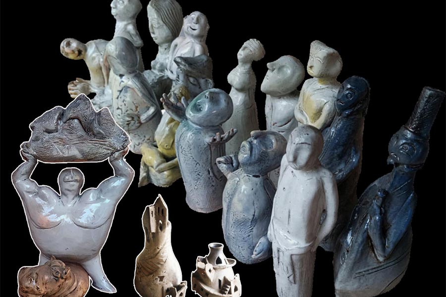 শিল্প মানেই কি গম্ভীর ভাবনা, জটিল নির্মিতি? খেয়ালখুশির রস লুকিয়ে আমাদের মনের গভীরে, তার প্রকাশ কি হতে পারে না শিল্প-অভিজ্ঞতা? প্রায় দু’দশক ধরে সেরামিক্স নিয়ে কাজ করছেন তমাল ভট্টাচার্য, বারুইপুরে বেনের চাঁদনি বাসস্টপের কাছে ‘স্টুডিয়ো ক্যালিক্স’ ওঁর বাড়ি ভাবনাঘর কর্মশালা সবই। তমাল ও তাঁর শিল্পীবন্ধুরা— সুস্মিতা চিত্রালী উদয় মৃন্ময়ী মেখলা প্রধি শ্রীপর্ণা শ্রেয়সী কথা রানি— গত কয়েক মাস ধরে সেখানেই মগ্ন ছিলেন সুকুমার রায়কে ঘিরে। ব্যাপারখানা কী? আবোল তাবোল-এর শতবর্ষ এ বছর, কে না জানে। সেরামিক্সের শিল্পকাজে ওঁরা ফুটিয়ে তুলেছেন এক-একটি ‘আবোল তাবোল’ ভাবনা: ‘দেহের ওজন উনিশটি মণ/ শক্ত যেন লোহার গঠন’ বা ‘আপনাকে আজ আপন হতে/ ভাসিয়ে দিলাম খেয়াল স্রোতে’ (ছবি)। আজ শুরু, ২৪ ডিসেম্বর পর্যন্ত, দুপুর ৩টে থেকে রাত ৮টা এই প্রদর্শনী দেখা যাবে স্টুডিয়ো ক্যালিক্সে। খেয়ালরসের শিল্প!