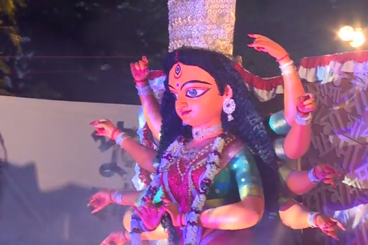 • ২১ পল্লী সর্বজনীনের পুজোর শোভাযাত্রায় আদিবাসী নৃত্যের ছবি ভেসে উঠল। এ বারের পুজোর থিম ছিল আঁধার।