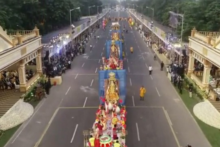 • বিকেল ৪টে ৪০ মিনিট। রেড রোড ধরে এগিয়ে এল শ্রীভূমি স্পোর্টিং ক্লাব। এবারে তাদের থিম পদ্মাবতী। রাজস্থানের চিতোর দুর্গের আদলে মণ্ডপ। একেবারে সামনে রয়েছেন গায়ক অভিজিৎ ভট্টাচার্য। ঢাক বাজাতে বাজাতে এগিয়ে চলেছেন তিনি।